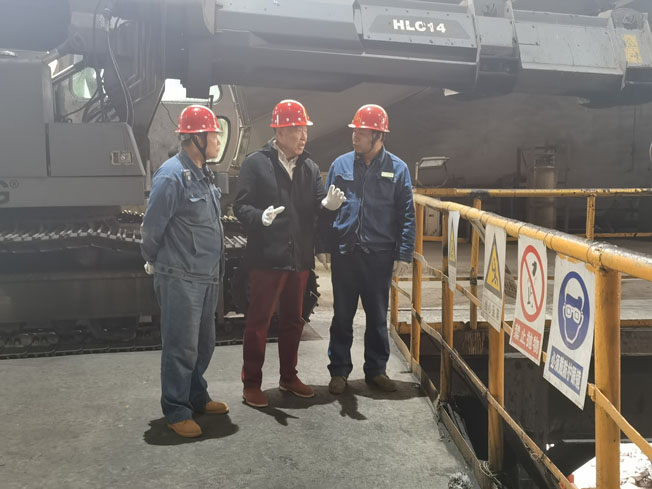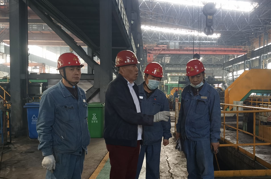董事長(zhǎng)(左二)在煉鋼廠檢修現(xiàn)場(chǎng)視察,公司副總調(diào)度長(zhǎng)李成哲(左一)、煉鋼廠廠長(zhǎng)閆海龍(右一)等主要領(lǐng)導(dǎo)全程陪同